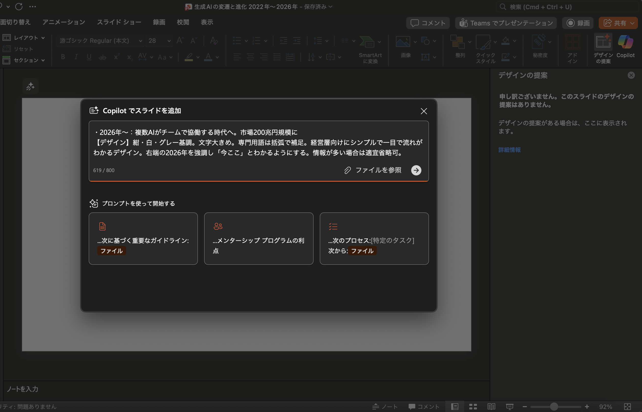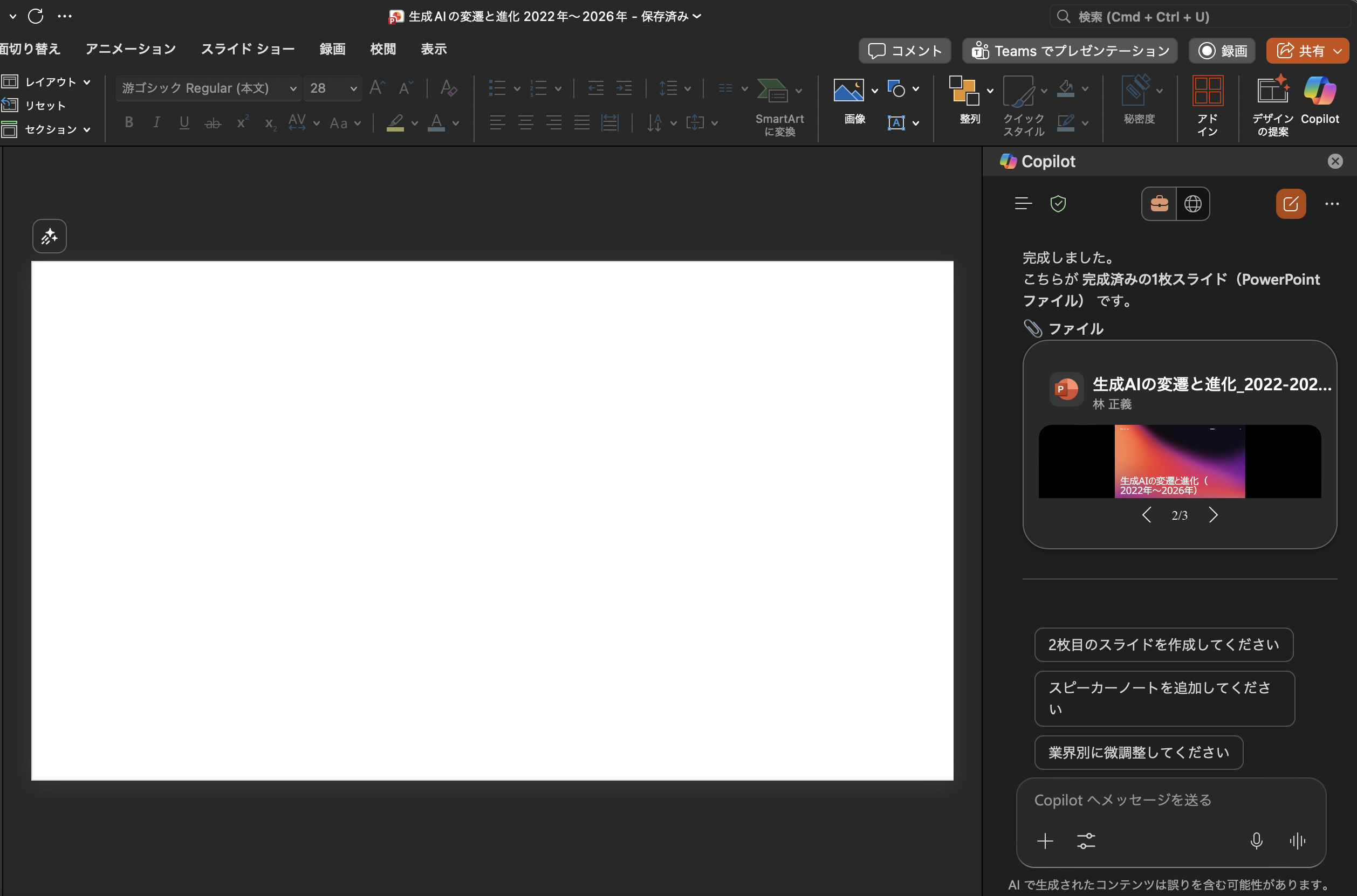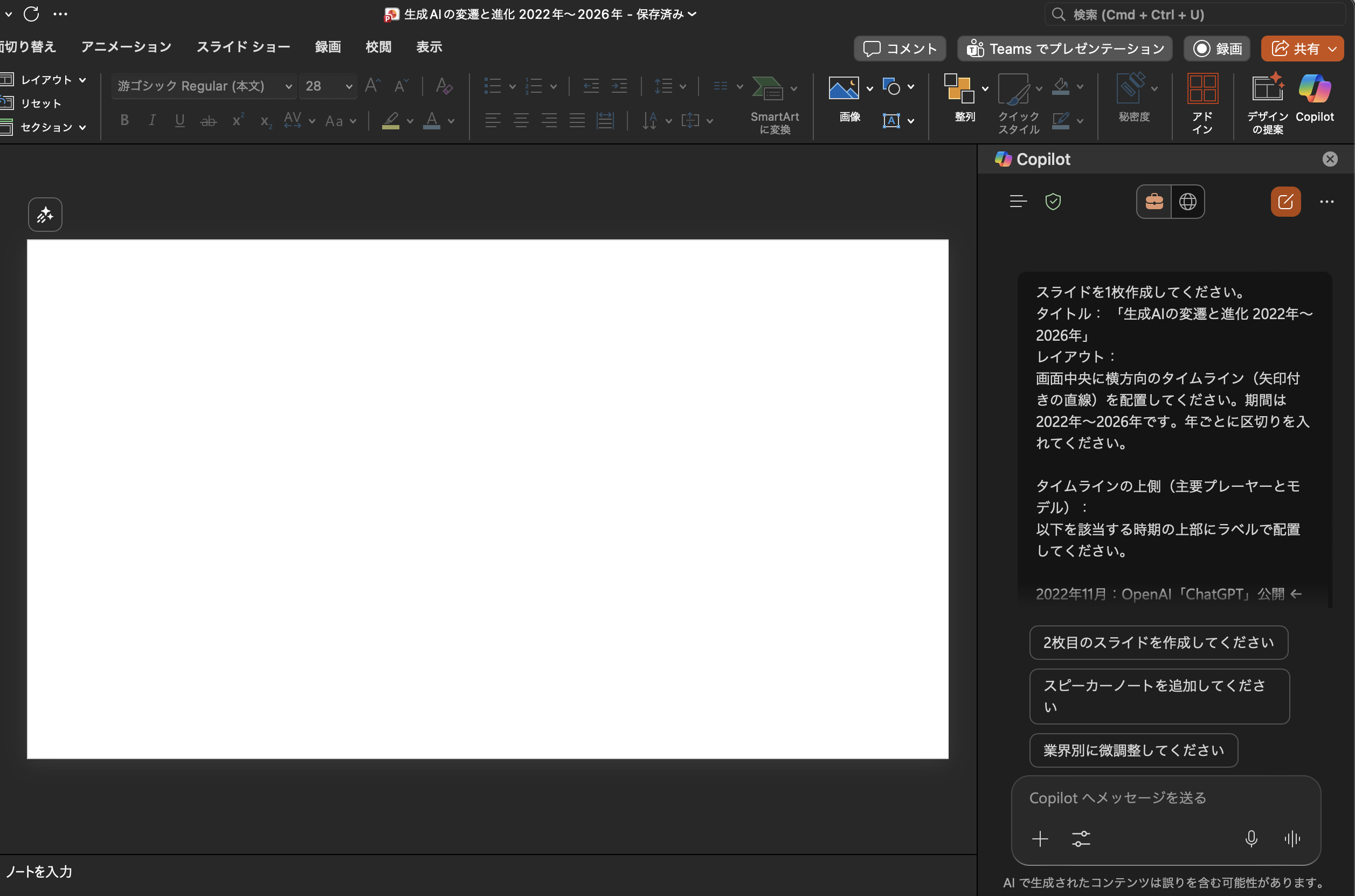 するとスライドは作成してくれましたが、資料上には反映されず、あくまでチャットの中で作成するという仕様でした。
