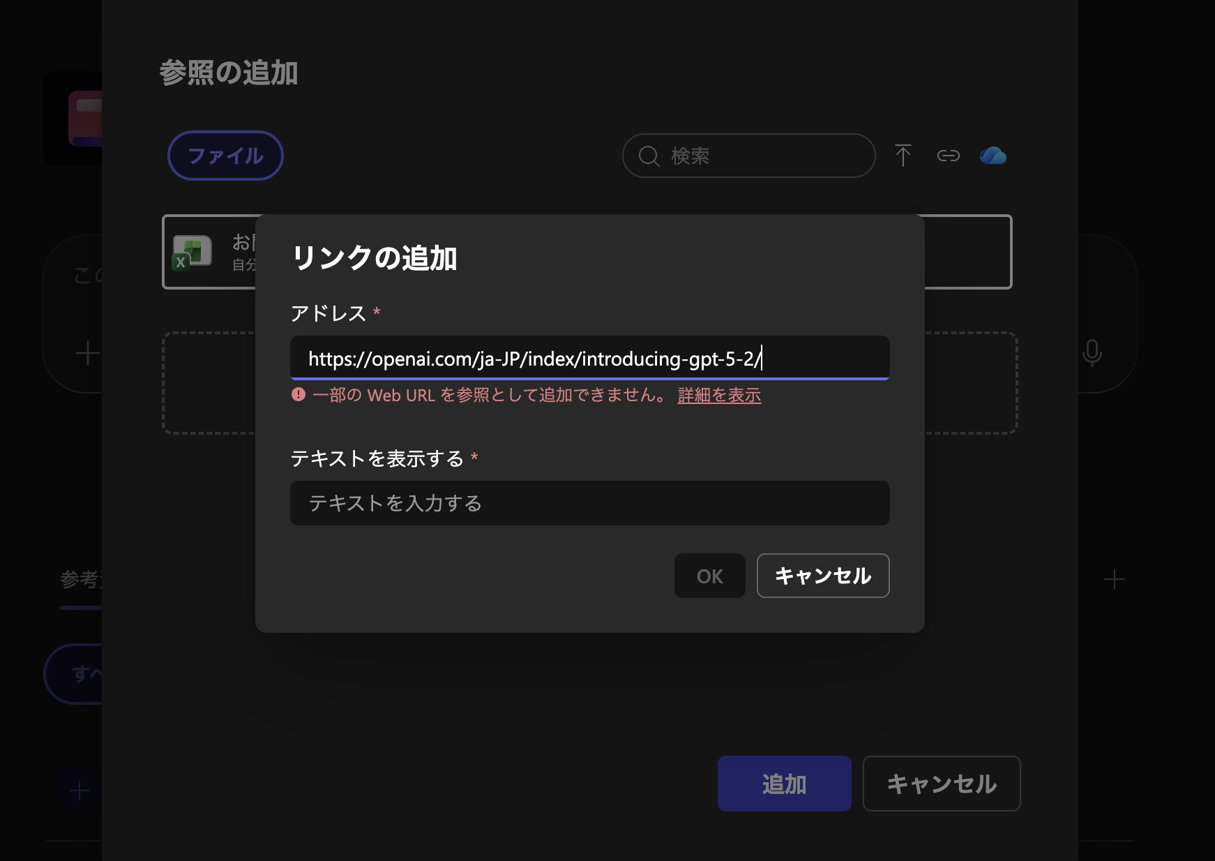 写真のようにCopilotNotebooksではリンクを追加という項目はあっても、通常のWebサイトのリンクを登録することには非対応のようで、MicrosoftSharePoint等のリンクのみに対応しているようです。OpenAI社の公式のGPT - 5.2のリリース情報が掲載されているページのリンクを挿入して比較する予定でしたが、CopilotNotebooksにはリンクから直接情報を入力することができないので、他の項目の比較のためにWebClipperと呼ばれるような汎用的なツールを用いて情報を入力しました。