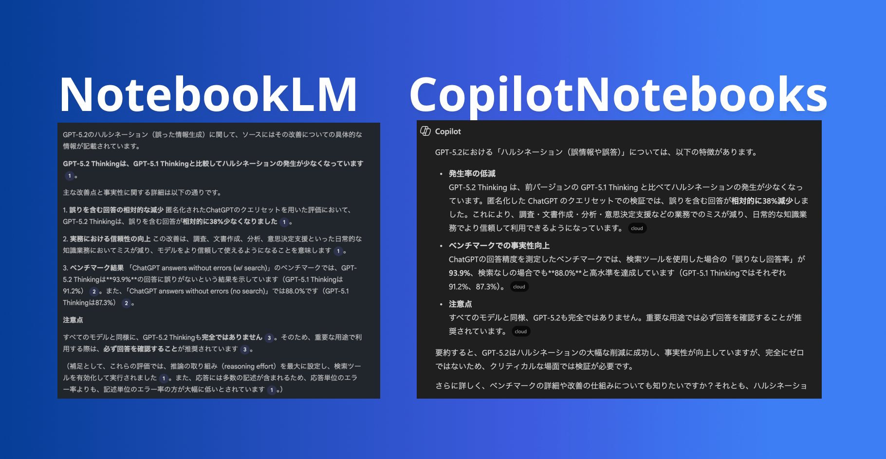 CopilotNotebooks、NotebookLMの両者に「GPT5.2のハルシネーションについて教えて」というプロンプトを投げかけてみました。