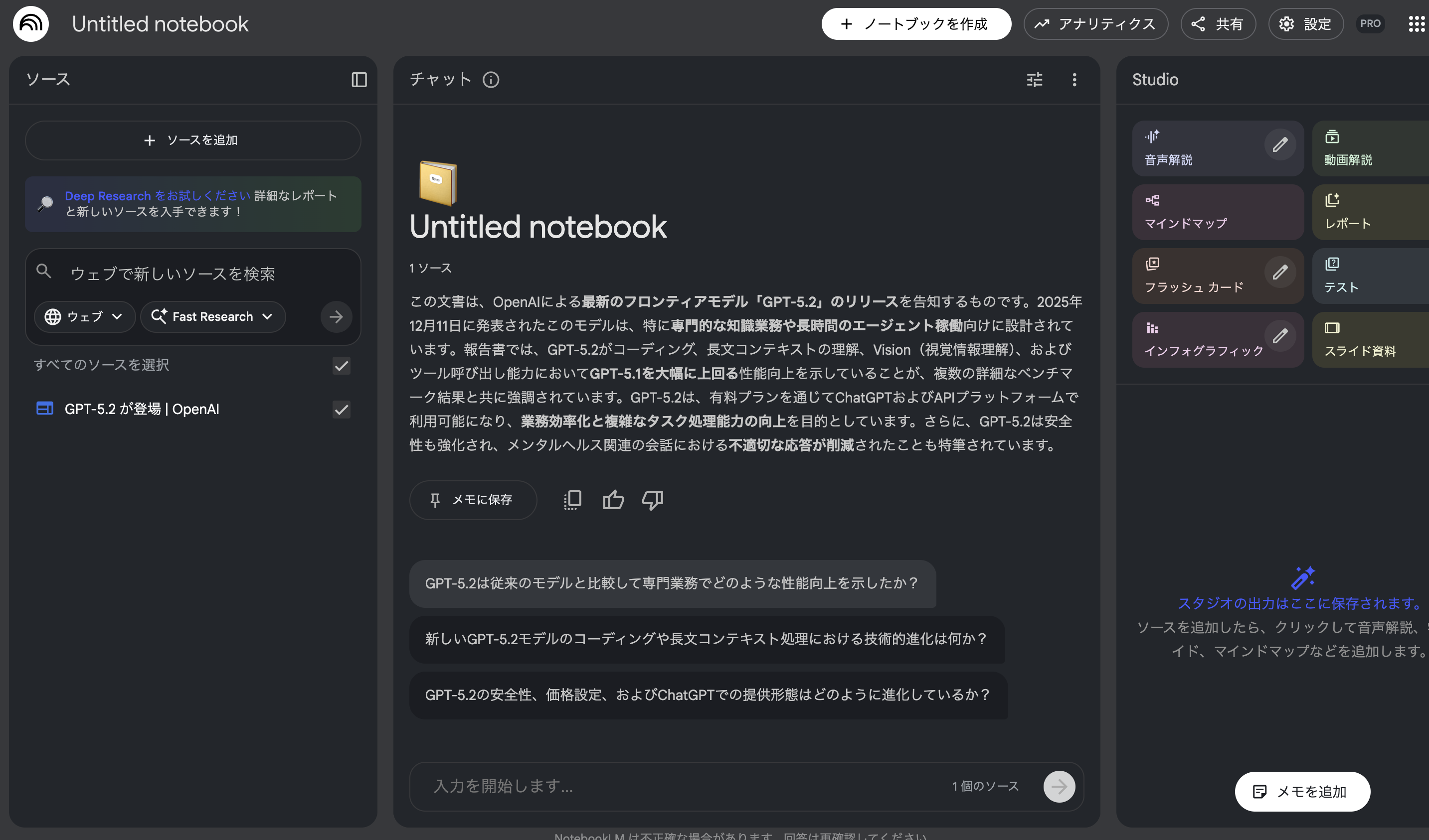 機能の多さという観点だけを見ると、現時点ではNotebookLMの方が「できることの幅」は広いと感じられる場面が多いはずです。