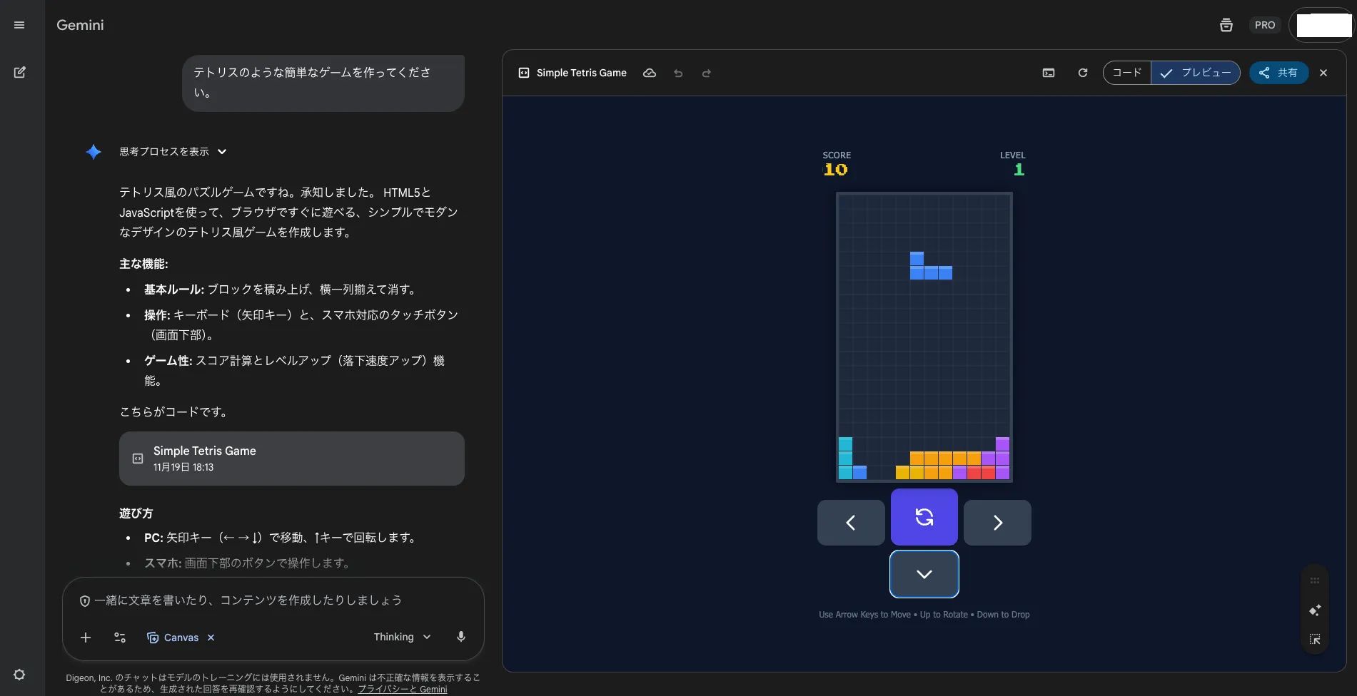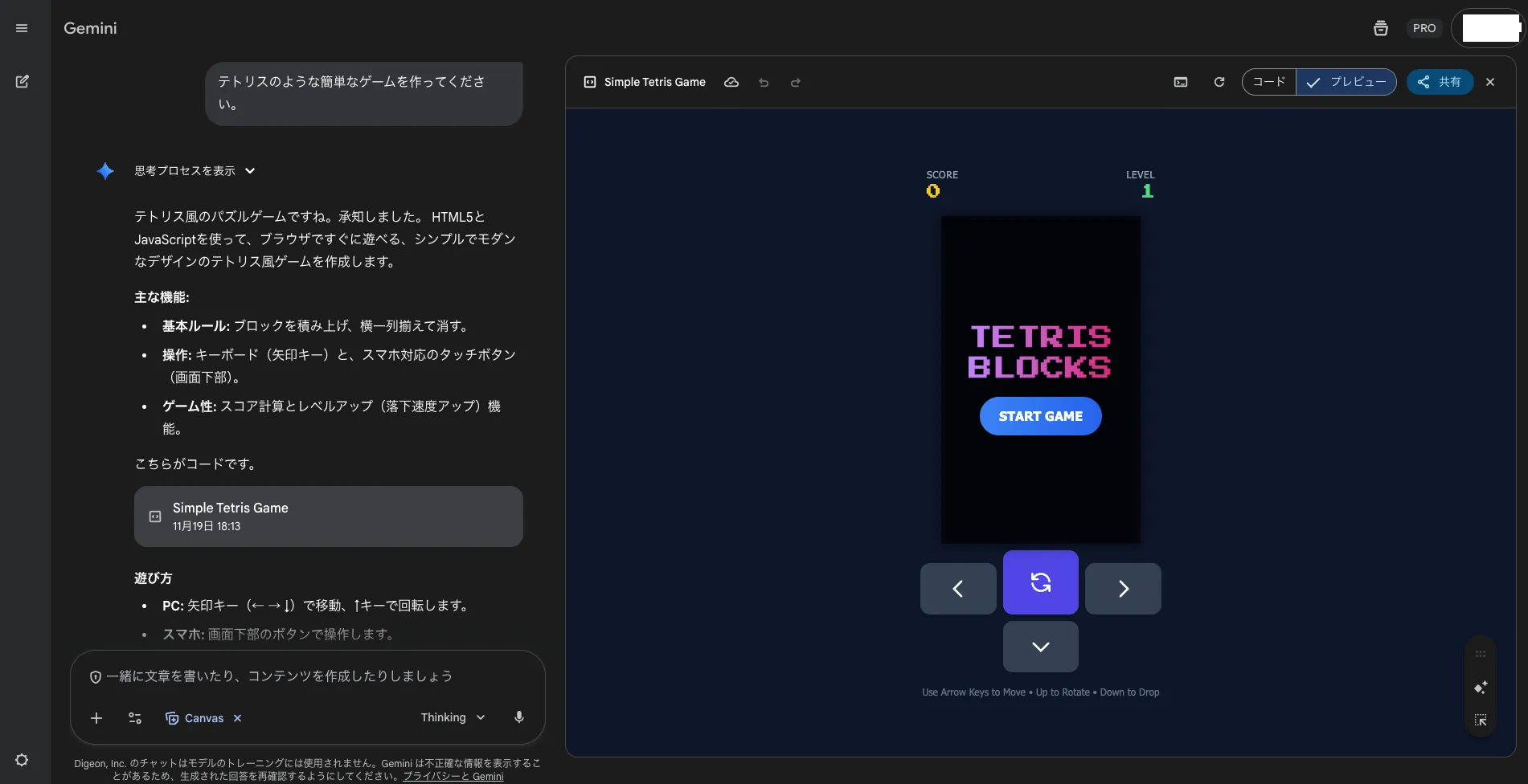 テトリスのような簡単なゲームを作ってください。この一文だけで、即座にコード生成が開始されます。
