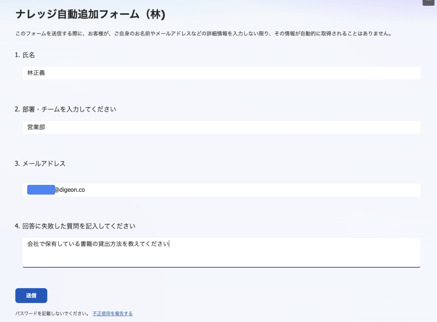 - ナレッジから回答できなかった場合、Microsoft Formsへのリンクを案内