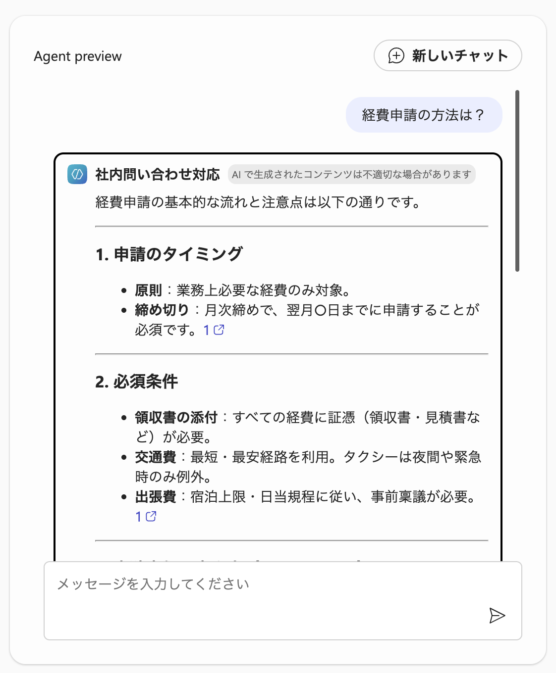 作成したエージェントに「経費申請の方法は?」と入力してみます。