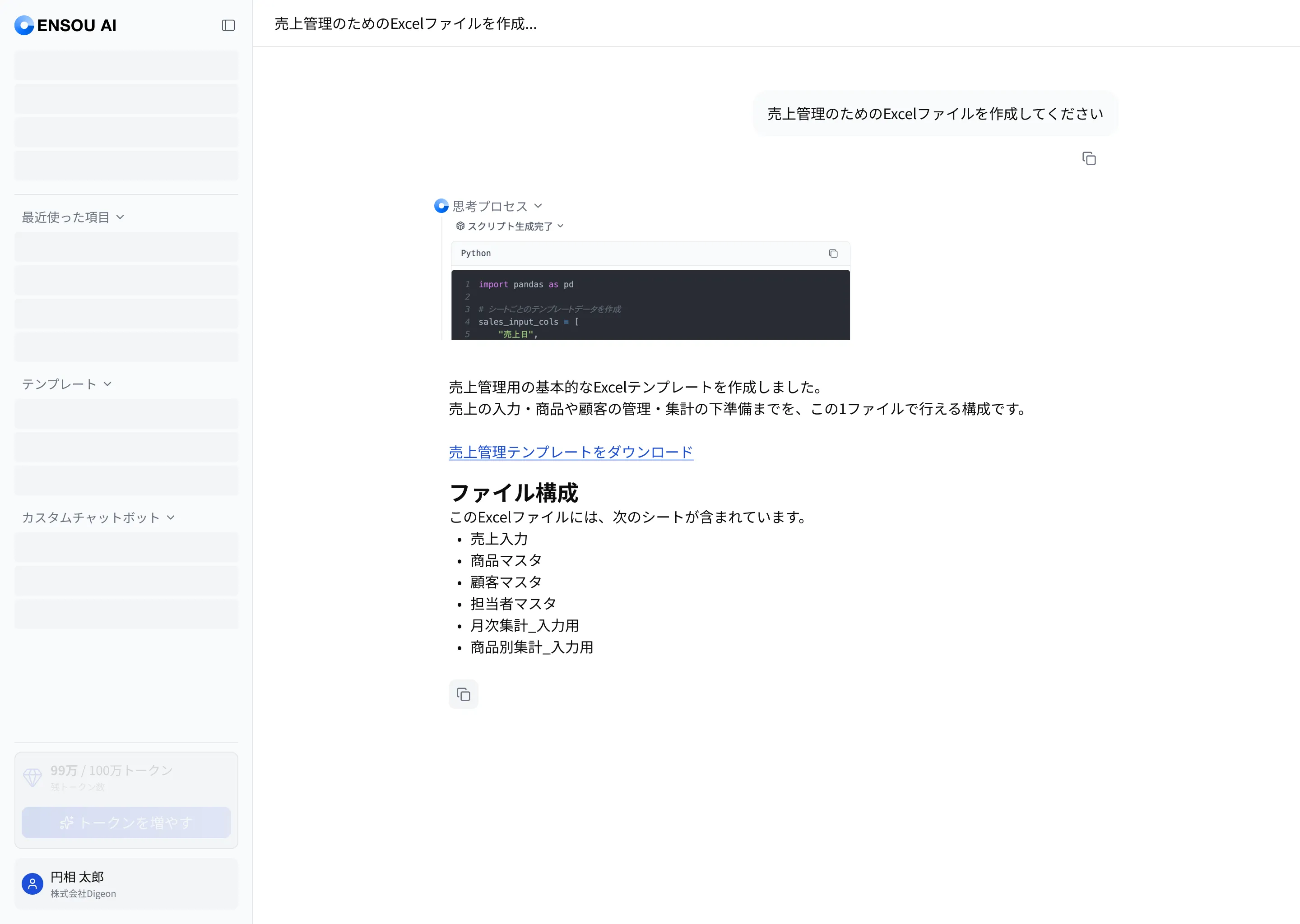 Word・Excel・PowerPoint形式で業務成果物を自動生成。細かな操作や判断を行わなくても、AIが自律的に業務を理解し、成果物を完成させます。