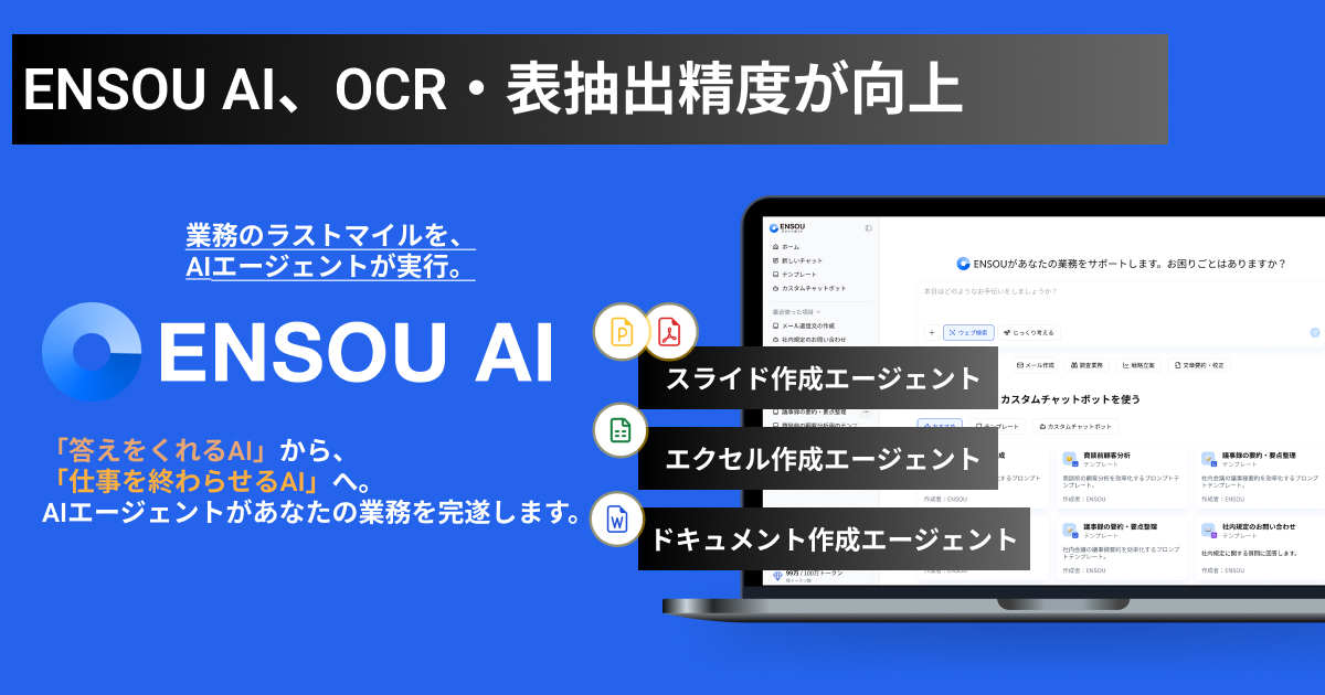 ENSOU AIは、PDFや画像のOCR(文字認識)や表抽出の精度を向上させるアップデートを実施しました。Geminiの導入により、スキャン資料や表を含むPDFからの情報抽出や文章解析がより正確になり、見積書・請求書・レポートの確認業務を効率化できます。ファイルを使ったAIチャットの精度と操作性もあわせて改善されています。