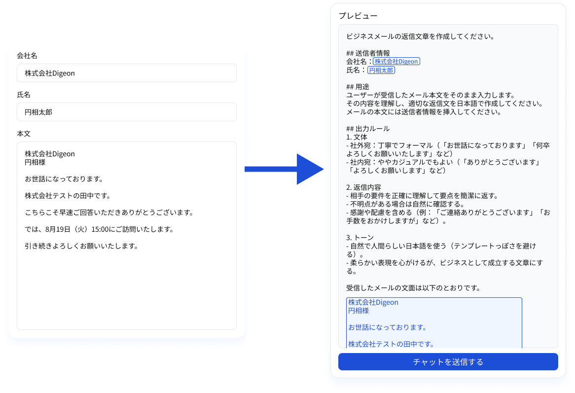 株式会社Digeon(本社:兵庫県神戸市、代表取締役社長:山﨑祐太)は、法人向け生成AIチャットボットサービス「ENSOUチャットボット」において、新機能「プロンプトテンプレート機能」を正式リリースしました。