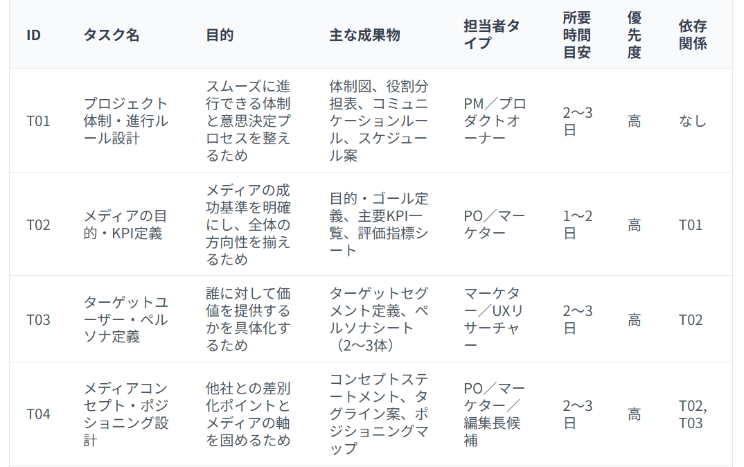 このテンプレートは入力されたタスクに対して、細かい粒度に落とし込み、目的・成果物・優先度・依存関係などの項目に関して整理し、「最初に着手するべき3つのタスク」とともにタスク一覧表として出力します。