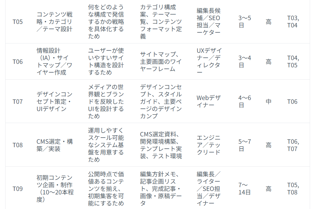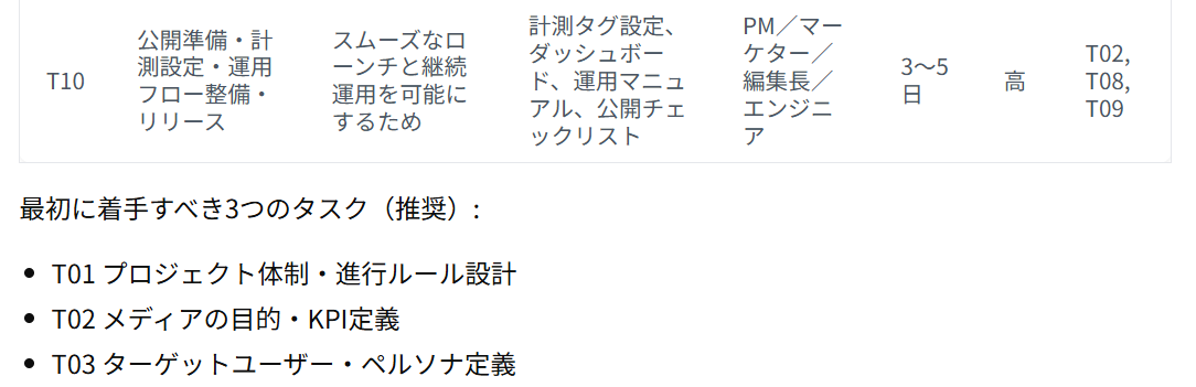 今回は、自社プロダクトのWebメディア立ち上げ、というタスクについての出力を確認します。